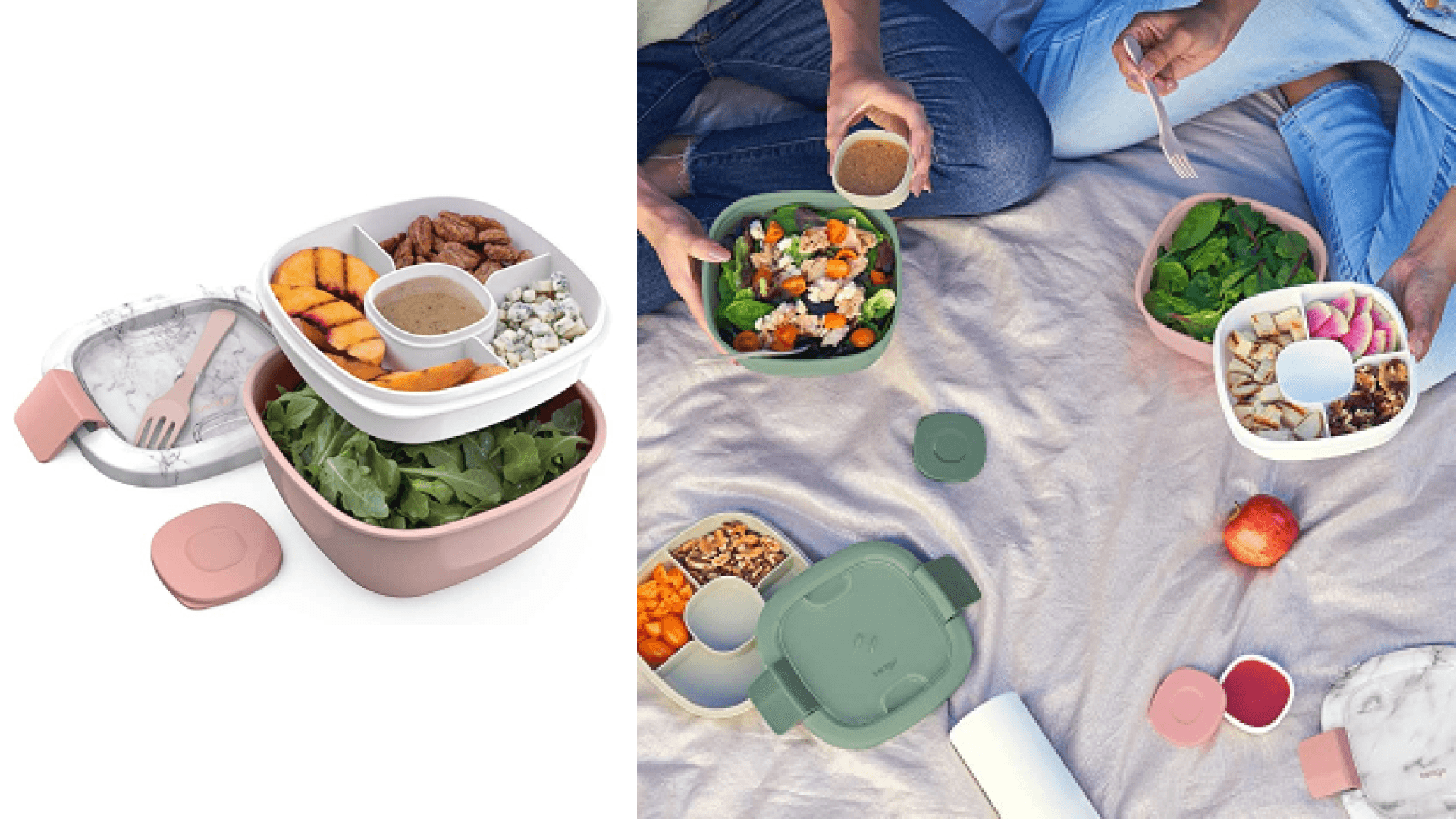 Soggy salads, no more. This handy bowl has four stackable compartments. One for your base, one for any toppings, one for condiments, and one for your utensil with a cover. The lid is airtight, so it’ll keep everything extra fresh. Bring it on the go or use it for easy meal prep at home. Obsessed. ({{dynamicPrice}}, Amazon)