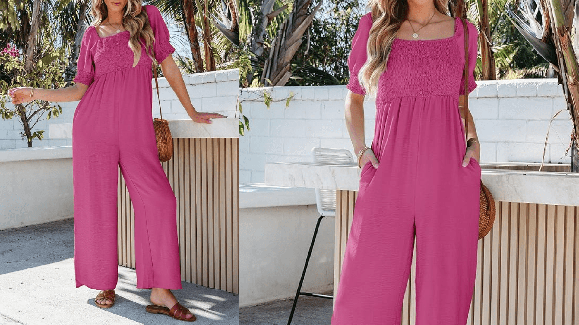 When it hits 90 degrees, the last thing you want to think about is getting dressed. This WFH-friendly jumpsuit has a smock bodice and wide-leg, linen-like pants. Dress it up with a stack of necklaces and sandals.